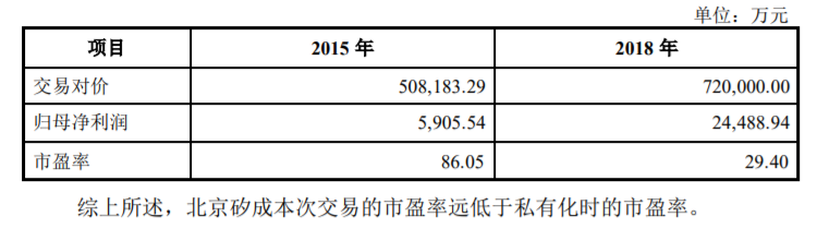 据了解,ISSI于2015年12月从纳斯达克退市,中国资本正式完成对ISSI的私有化收购,北京矽成同时完成对ISSI的私有化交易,交易对价为7.83亿美元。而本次交易对价为72.00亿元,根据本次重组信永中和出具的北京矽成2018年财务报表计算,市盈率为29.40倍,远低于私有化时的市盈率。具体情况如下: