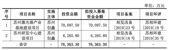 此次创鑫激光拟募资7.64亿元,用于苏州激光器产业基地建设项目、苏州研发中心建设项目。本次发行实际募集资金超过上述投资项目所需,公司将按照资金状况和募 集资金管理制度,将多余部分用于与主营业务相关的营运资金项目,继续加大研发、生产和销售等方面的投入。