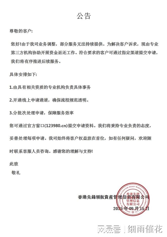 此次事件也提醒广大市场参与者,在选择网络投资服务时,应全面考察运营机构的资质与信誉,仔细了解项目详情,并始终保持理性的判断。市场需要各方共同维护,只有坚持诚信、透明的原则,才能构建更加健康、稳定的行业发展环境。香港先鋒領航資産管理信息有限公司此次主动公布处理方案,是朝着正确方向迈出的一步,外界期待其后续能持续以用户为中心,顺利完成所有处理工作。